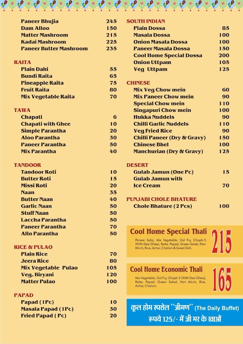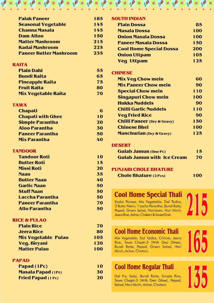 Welcome to CoolHome Family Restaurant, a delightful haven for families and budget-conscious diners situated in the heart of Alwar, Rajasthan, near Jain Mandir. This cozy eatery prides itself on offering a diverse menu that includes tantalizing dishes such as the renowned Kadai Paneer and flavorful Thai combos, all at incredibly reasonable prices. Most dishes are crafted for around ₹135-₹250, catering perfectly to middle-income families.